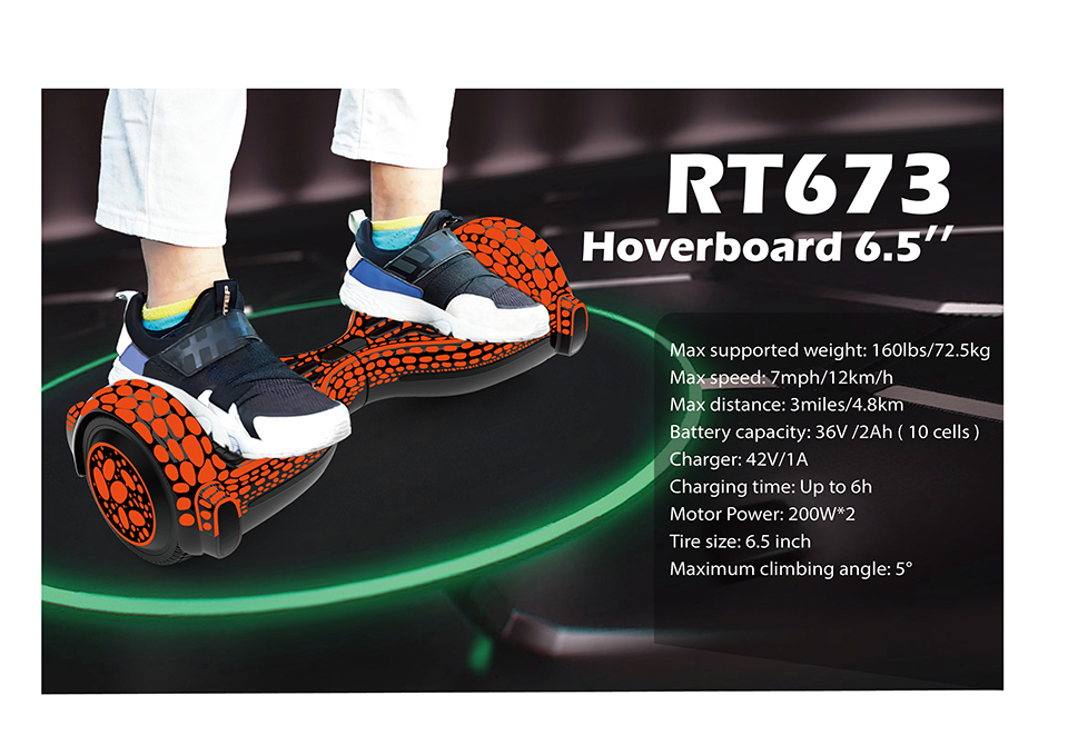 Max supported weight: 160lbs/72.5kg Max speed: 7mph/12km/h Max distance: 3miles/4.8kmBattery capacity: 36V /2Ah ( 10 cells ) Charger: 42V/1A Charging time: Up to 6h Motor Power: 200W*2Tire size: 6.5 inch Maximum climbing angle: 5°